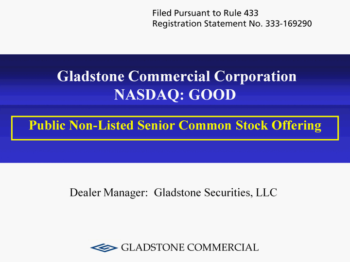 | Gladstone Commercial Corporation NASDAQ: GOOD Public Non-Listed Senior Common Stock Offering Dealer Manager: Gladstone Securities, LLC Filed Pursuant to Rule 433 Registration Statement No. 333-169290 |