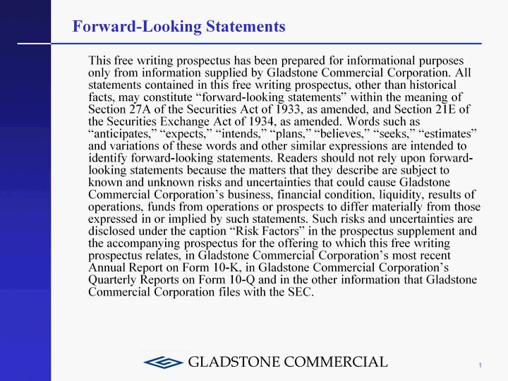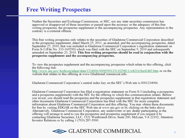 | Forward-Looking Statements This free writing prospectus has been prepared for informational purposes only from information supplied by Gladstone Commercial Corporation. All statements contained in this free writing prospectus, other than historical facts, may constitute "forward-looking statements" within the meaning of Section 27A of the Securities Act of 1933, as amended, and Section 21E of the Securities Exchange Act of 1934, as amended. Words such as "anticipates," "expects," "intends," "plans," "believes," "seeks," "estimates" and variations of these words and other similar expressions are intended to identify forward-looking statements. Readers should not rely upon forward- looking statements because the matters that they describe are subject to known and unknown risks and uncertainties that could cause Gladstone Commercial Corporation's business, financial condition, liquidity, results of operations, funds from operations or prospects to differ materially from those expressed in or implied by such statements. Such risks and uncertainties are disclosed under the caption "Risk Factors" in the prospectus supplement and the accompanying prospectus for the offering to which this free writing prospectus relates, in Gladstone Commercial Corporation's most recent Annual Report on Form 10-K, in Gladstone Commercial Corporation's Quarterly Reports on Form 10-Q and in the other information that Gladstone Commercial Corporation files with the SEC. 1 |