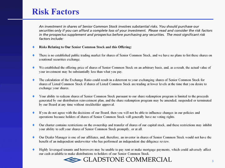 | Risk Factors An investment in shares of Senior Common Stock involves substantial risks. You should purchase our securities only if you can afford a complete loss of your investment. Please read and consider the risk factors in the prospectus supplement and prospectus before purchasing any securities. The most significant risk factors include: Risks Relating to Our Senior Common Stock and this Offering: There is no established public trading market for shares of Senior Common Stock, and we have no plans to list these shares on a national securities exchange. We established the offering price of shares of Senior Common Stock on an arbitrary basis, and, as a result, the actual value of your investment may be substantially less than what you pay. The calculation of the Exchange Ratio could result in a deterrent to your exchanging shares of Senior Common Stock for shares of Listed Common Stock if shares of Listed Common Stock are trading at lower levels at the time that you desire to exchange your shares. Your ability to redeem shares of Senior Common Stock pursuant to our share redemption program is limited to the proceeds generated by our distribution reinvestment plan, and the share redemption program may be amended, suspended or terminated by our Board at any time without stockholder approval. If you do not agree with the decisions of our Board, then you will not be able to influence changes in our policies and operations because holders of shares of Senior Common Stock will generally have no voting rights. Our charter contains restrictions on the ownership and transfer of shares of our capital stock, and these restrictions may inhibit your ability to sell your shares of Senior Common Stock promptly, or at all. Our Dealer Manager is one of our affiliates, and, therefore, an investor in shares of Senior Common Stock would not have the benefit of an independent underwriter who has performed an independent due diligence review. Highly leveraged tenants and borrowers may be unable to pay rent or make mortgage payments, which could adversely affect our cash available to make distributions to holders of our Senior Common Stock. 3 |