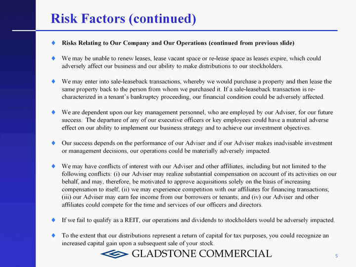 | Risk Factors (continued) Risks Relating to Our Company and Our Operations Our business strategy relies heavily on external financing, which may expose us to risks associated with leverage such as restrictions on additional borrowing and payment of distributions to stockholders, risks associated with balloon payments, and risk of loss of our equity upon foreclosure . We are subject to certain risks associated with real estate ownership and lending which could reduce the value of our investments, including but not limited to, changes in the general economic climate; changes in local conditions such as an oversupply of space or reduction in demand for real estate; changes in interest rates and the availability of financing; competition from other available space; and changes in laws and governmental regulations, including those governing real estate usage, zoning and taxes. Our properties may be subject to impairment charges, which could adversely affect our results of operations and FFO. Illiquidity of real estate investments may make it difficult for us to sell properties in response to market conditions and our properties may include special use and single or multi-tenant properties that may be difficult to sell or re-lease upon tenant defaults or early lease terminations which could harm our financial condition and ability to make distributions. Our real estate investments have a limited number of tenants, many of which are small- and medium-sized businesses, and are concentrated in a limited number of industries, which subjects us to an increased risk of significant loss if any one of these tenants is unable to pay or if particular industries experience downturns. 4 |