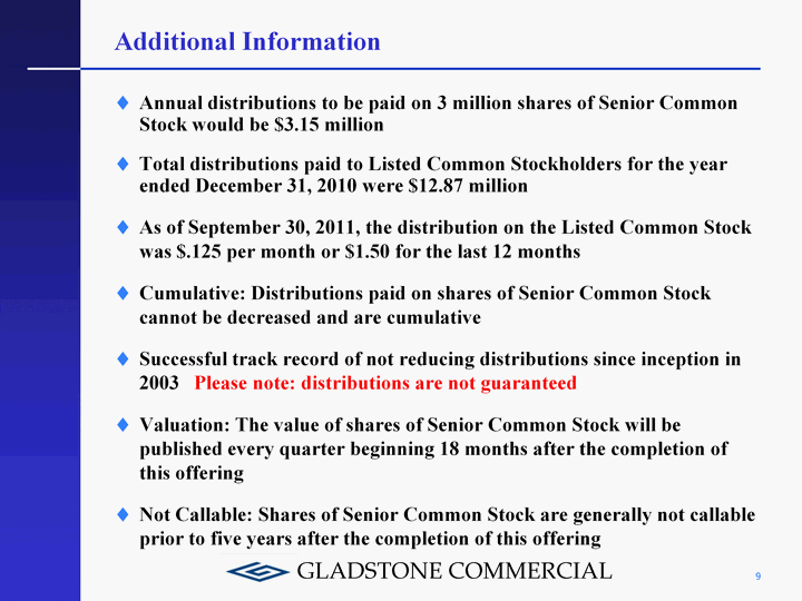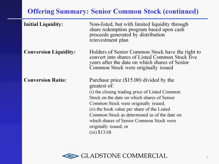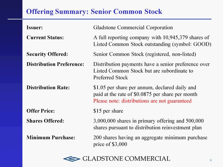 | Offering Summary: Senior Common Stock 6 Issuer: Gladstone Commercial Corporation Current Status: A full reporting company with 10,945,379 shares of Listed Common Stock outstanding (symbol: GOOD) Security Offered: Senior Common Stock (registered, non-listed) Distribution Preference: Distribution payments have a senior preference over Listed Common Stock but are subordinate to Preferred Stock Distribution Rate: $1.05 per share per annum, declared daily and paid at the rate of $0.0875 per share per month Please note: distributions are not guaranteed Offer Price: $15 per share Shares Offered: 3,000,000 shares in primary offering and 500,000 shares pursuant to distribution reinvestment plan Minimum Purchase: 200 shares having an aggregate minimum purchase price of $3,000 |