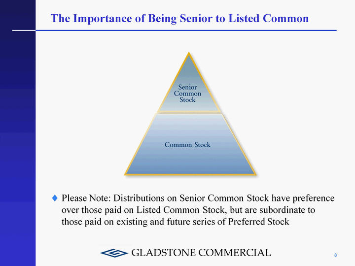 | The Importance of Being Senior to Listed Common Please Note: Distributions on Senior Common Stock have preference over those paid on Listed Common Stock, but are subordinate to those paid on existing and future series of Preferred Stock 8 |