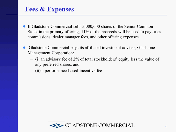 | Fees & Expenses If Gladstone Commercial sells 3,000,000 shares of the Senior Common Stock in the primary offering, 11% of the proceeds will be used to pay sales commissions, dealer manager fees, and other offering expenses Gladstone Commercial pays its affiliated investment adviser, Gladstone Management Corporation: (i) an advisory fee of 2% of total stockholders' equity less the value of any preferred shares, and (ii) a performance-based incentive fee 10 |