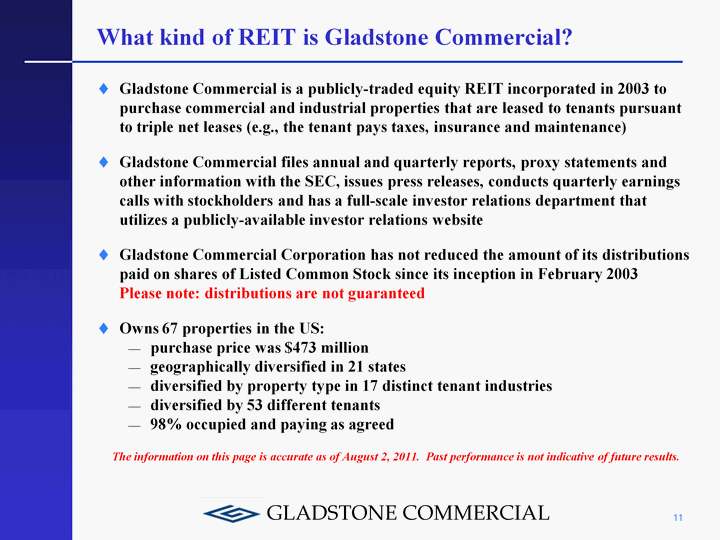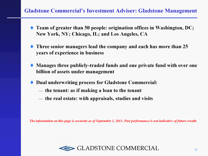 | What kind of REIT is Gladstone Commercial? Gladstone Commercial is a publicly-traded equity REIT incorporated in 2003 to purchase commercial and industrial properties that are leased to tenants pursuant to triple net leases (e.g., the tenant pays taxes, insurance and maintenance) Gladstone Commercial files annual and quarterly reports, proxy statements and other information with the SEC, issues press releases, conducts quarterly earnings calls with stockholders and has a full-scale investor relations department that utilizes a publicly-available investor relations website Gladstone Commercial Corporation has not reduced the amount of its distributions paid on shares of Listed Common Stock since its inception in February 2003 Please note: distributions are not guaranteed Owns 67 properties in the US: purchase price was $473 million geographically diversified in 21 states diversified by property type in 17 distinct tenant industries diversified by 53 different tenants 98% occupied and paying as agreed The information on this page is accurate as of August 2, 2011. Past performance is not indicative of future results. 11 |