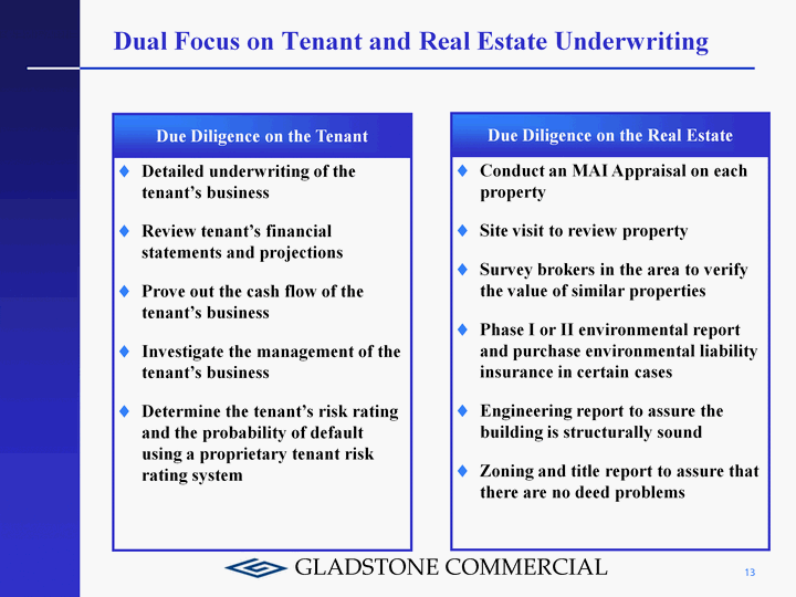 | Gladstone Commercial's Investment Adviser: Gladstone Management Team of greater than 50 people: origination offices in Washington, DC; New York, NY; Chicago, IL; and Los Angeles, CA Three senior managers lead the company and each has more than 25 years of experience in business Manages three publicly-traded funds and one private fund with over one billion of assets under management Dual underwriting process for Gladstone Commercial: the tenant: as if making a loan to the tenant the real estate: with appraisals, studies and visits The information on this page is accurate as of September 1, 2011. Past performance is not indicative of future results 12 |