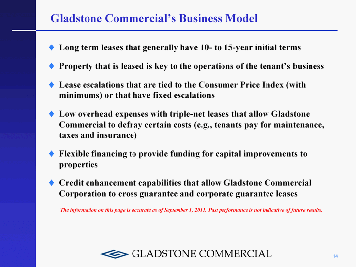 | Gladstone Commercial's Business Model Long term leases that generally have 10- to 15-year initial terms Property that is leased is key to the operations of the tenant's business Lease escalations that are tied to the Consumer Price Index (with minimums) or that have fixed escalations Low overhead expenses with triple-net leases that allow Gladstone Commercial to defray certain costs (e.g., tenants pay for maintenance, taxes and insurance) Flexible financing to provide funding for capital improvements to properties Credit enhancement capabilities that allow Gladstone Commercial Corporation to cross guarantee and corporate guarantee leases The information on this page is accurate as of September 1, 2011. Past performance is not indicative of future results. 14 |