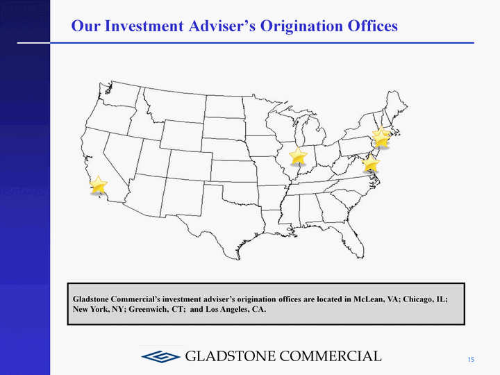 | Our Investment Adviser's Origination Offices 15 Gladstone Commercial's investment adviser's origination offices are located in McLean, VA; Chicago, IL; New York, NY; Greenwich, CT; and Los Angeles, CA. |