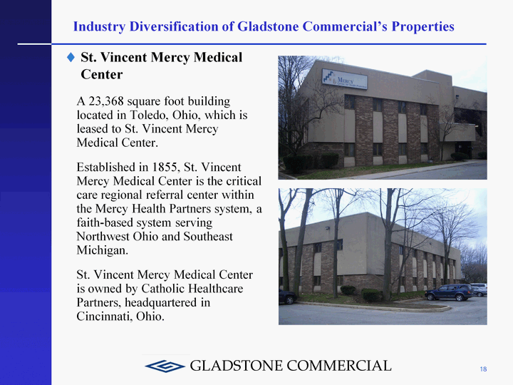 | 18 Industry Diversification of Gladstone Commercial's Properties A 23,368 square foot building located in Toledo, Ohio, which is leased to St. Vincent Mercy Medical Center. Established in 1855, St. Vincent Mercy Medical Center is the critical care regional referral center within the Mercy Health Partners system, a faith-based system serving Northwest Ohio and Southeast Michigan. St. Vincent Mercy Medical Center is owned by Catholic Healthcare Partners, headquartered in Cincinnati, Ohio. St. Vincent Mercy Medical Center |