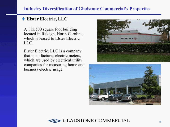 | 19 Industry Diversification of Gladstone Commercial's Properties A 115,500 square foot building located in Raleigh, North Carolina, which is leased to Elster Electric, LLC. Elster Electric, LLC is a company that manufactures electric meters, which are used by electrical utility companies for measuring home and business electric usage. Elster Electric, LLC |