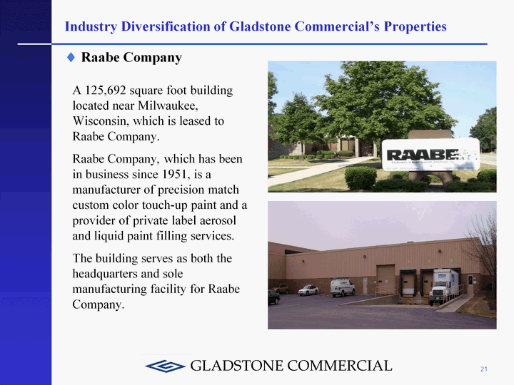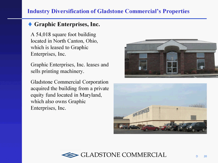 | 20 Industry Diversification of Gladstone Commercial's Properties A 54,018 square foot building located in North Canton, Ohio, which is leased to Graphic Enterprises, Inc. Graphic Enterprises, Inc. leases and sells printing machinery. Gladstone Commercial Corporation acquired the building from a private equity fund located in Maryland, which also owns Graphic Enterprises, Inc. Graphic Enterprises, Inc. D |