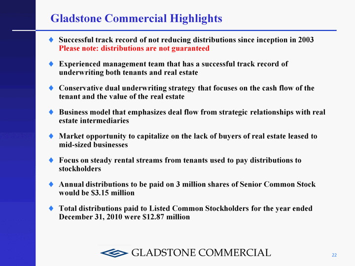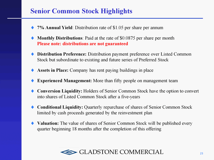 | Gladstone Commercial Highlights Successful track record of not reducing distributions since inception in 2003 Please note: distributions are not guaranteed Experienced management team that has a successful track record of underwriting both tenants and real estate Conservative dual underwriting strategy that focuses on the cash flow of the tenant and the value of the real estate Business model that emphasizes deal flow from strategic relationships with real estate intermediaries Market opportunity to capitalize on the lack of buyers of real estate leased to mid-sized businesses Focus on steady rental streams from tenants used to pay distributions to stockholders Annual distributions to be paid on 3 million shares of Senior Common Stock would be $3.15 million Total distributions paid to Listed Common Stockholders for the year ended December 31, 2010 were $12.87 million 22 |