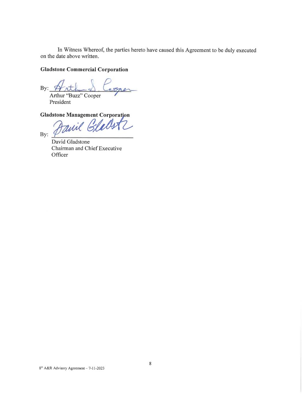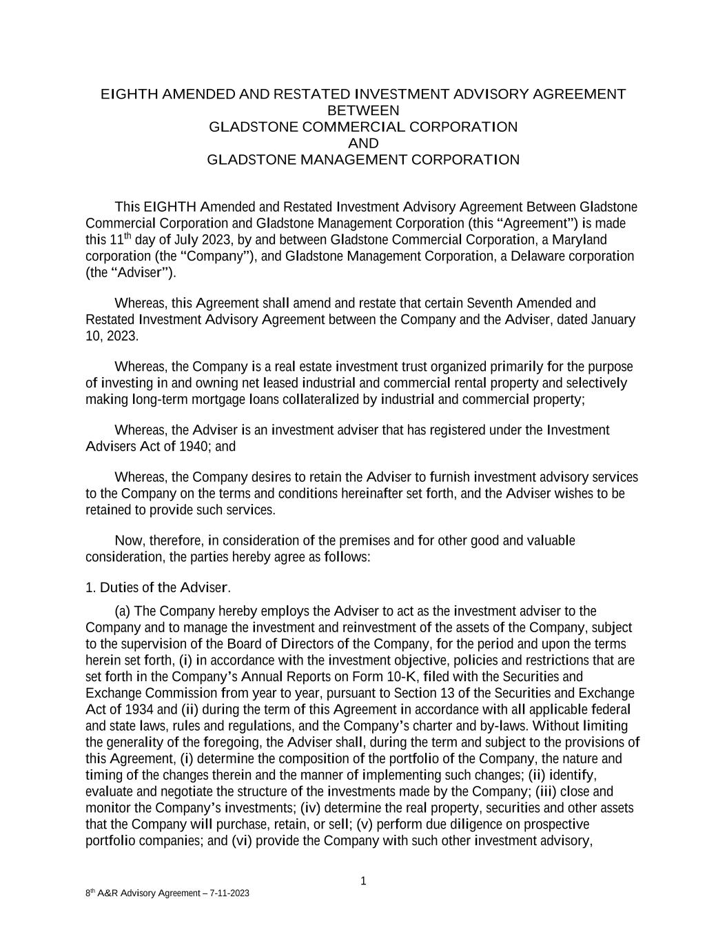 1 8th A&R Advisory Agreement – 7-11-2023 EIGHTH AMENDED AND RESTATED INVESTMENT ADVISORY AGREEMENT BETWEEN GLADSTONE COMMERCIAL CORPORATION AND GLADSTONE MANAGEMENT CORPORATION This EIGHTH Amended and Restated Investment Advisory Agreement Between Gladstone Commercial Corporation and Gladstone Management Corporation (this “Agreement”) is made this 11th day of July 2023, by and between Gladstone Commercial Corporation, a Maryland corporation (the “Company”), and Gladstone Management Corporation, a Delaware corporation (the “Adviser”). Whereas, this Agreement shall amend and restate that certain Seventh Amended and Restated Investment Advisory Agreement between the Company and the Adviser, dated January 10, 2023. Whereas, the Company is a real estate investment trust organized primarily for the purpose of investing in and owning net leased industrial and commercial rental property and selectively making long-term mortgage loans collateralized by industrial and commercial property; Whereas, the Adviser is an investment adviser that has registered under the Investment Advisers Act of 1940; and Whereas, the Company desires to retain the Adviser to furnish investment advisory services to the Company on the terms and conditions hereinafter set forth, and the Adviser wishes to be retained to provide such services. Now, therefore, in consideration of the premises and for other good and valuable consideration, the parties hereby agree as follows: 1. Duties of the Adviser. (a) The Company hereby employs the Adviser to act as the investment adviser to the Company and to manage the investment and reinvestment of the assets of the Company, subject to the supervision of the Board of Directors of the Company, for the period and upon the terms herein set forth, (i) in accordance with the investment objective, policies and restrictions that are set forth in the Company’s Annual Reports on Form 10-K, filed with the Securities and Exchange Commission from year to year, pursuant to Section 13 of the Securities and Exchange Act of 1934 and (ii) during the term of this Agreement in accordance with all applicable federal and state laws, rules and regulations, and the Company’s charter and by-laws. Without limiting the generality of the foregoing, the Adviser shall, during the term and subject to the provisions of this Agreement, (i) determine the composition of the portfolio of the Company, the nature and timing of the changes therein and the manner of implementing such changes; (ii) identify, evaluate and negotiate the structure of the investments made by the Company; (iii) close and monitor the Company’s investments; (iv) determine the real property, securities and other assets that the Company will purchase, retain, or sell; (v) perform due diligence on prospective portfolio companies; and (vi) provide the Company with such other investment advisory,