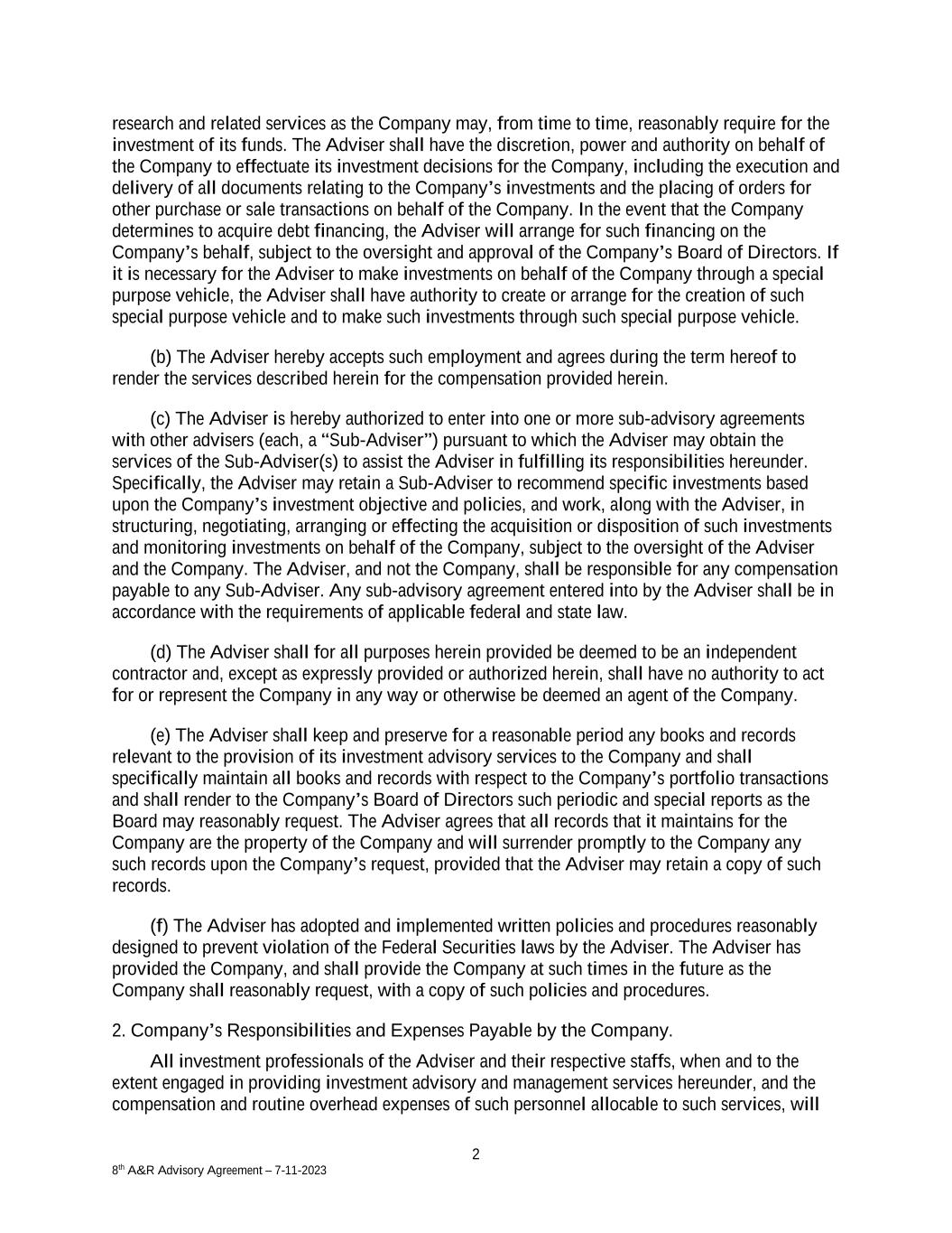 2 8th A&R Advisory Agreement – 7-11-2023 research and related services as the Company may, from time to time, reasonably require for the investment of its funds. The Adviser shall have the discretion, power and authority on behalf of the Company to effectuate its investment decisions for the Company, including the execution and delivery of all documents relating to the Company’s investments and the placing of orders for other purchase or sale transactions on behalf of the Company. In the event that the Company determines to acquire debt financing, the Adviser will arrange for such financing on the Company’s behalf, subject to the oversight and approval of the Company’s Board of Directors. If it is necessary for the Adviser to make investments on behalf of the Company through a special purpose vehicle, the Adviser shall have authority to create or arrange for the creation of such special purpose vehicle and to make such investments through such special purpose vehicle. (b) The Adviser hereby accepts such employment and agrees during the term hereof to render the services described herein for the compensation provided herein. (c) The Adviser is hereby authorized to enter into one or more sub-advisory agreements with other advisers (each, a “Sub-Adviser”) pursuant to which the Adviser may obtain the services of the Sub-Adviser(s) to assist the Adviser in fulfilling its responsibilities hereunder. Specifically, the Adviser may retain a Sub-Adviser to recommend specific investments based upon the Company’s investment objective and policies, and work, along with the Adviser, in structuring, negotiating, arranging or effecting the acquisition or disposition of such investments and monitoring investments on behalf of the Company, subject to the oversight of the Adviser and the Company. The Adviser, and not the Company, shall be responsible for any compensation payable to any Sub-Adviser. Any sub-advisory agreement entered into by the Adviser shall be in accordance with the requirements of applicable federal and state law. (d) The Adviser shall for all purposes herein provided be deemed to be an independent contractor and, except as expressly provided or authorized herein, shall have no authority to act for or represent the Company in any way or otherwise be deemed an agent of the Company. (e) The Adviser shall keep and preserve for a reasonable period any books and records relevant to the provision of its investment advisory services to the Company and shall specifically maintain all books and records with respect to the Company’s portfolio transactions and shall render to the Company’s Board of Directors such periodic and special reports as the Board may reasonably request. The Adviser agrees that all records that it maintains for the Company are the property of the Company and will surrender promptly to the Company any such records upon the Company’s request, provided that the Adviser may retain a copy of such records. (f) The Adviser has adopted and implemented written policies and procedures reasonably designed to prevent violation of the Federal Securities laws by the Adviser. The Adviser has provided the Company, and shall provide the Company at such times in the future as the Company shall reasonably request, with a copy of such policies and procedures. 2. Company’s Responsibilities and Expenses Payable by the Company. All investment professionals of the Adviser and their respective staffs, when and to the extent engaged in providing investment advisory and management services hereunder, and the compensation and routine overhead expenses of such personnel allocable to such services, will