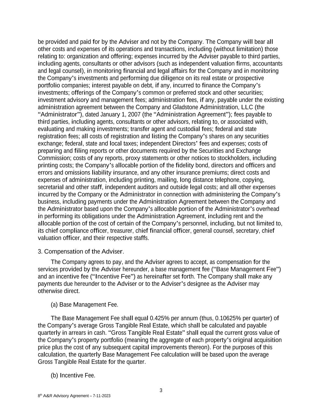 3 8th A&R Advisory Agreement – 7-11-2023 be provided and paid for by the Adviser and not by the Company. The Company will bear all other costs and expenses of its operations and transactions, including (without limitation) those relating to: organization and offering; expenses incurred by the Adviser payable to third parties, including agents, consultants or other advisors (such as independent valuation firms, accountants and legal counsel), in monitoring financial and legal affairs for the Company and in monitoring the Company’s investments and performing due diligence on its real estate or prospective portfolio companies; interest payable on debt, if any, incurred to finance the Company’s investments; offerings of the Company’s common or preferred stock and other securities; investment advisory and management fees; administration fees, if any, payable under the existing administration agreement between the Company and Gladstone Administration, LLC (the “Administrator”), dated January 1, 2007 (the “Administration Agreement”); fees payable to third parties, including agents, consultants or other advisors, relating to, or associated with, evaluating and making investments; transfer agent and custodial fees; federal and state registration fees; all costs of registration and listing the Company’s shares on any securities exchange; federal, state and local taxes; independent Directors’ fees and expenses; costs of preparing and filing reports or other documents required by the Securities and Exchange Commission; costs of any reports, proxy statements or other notices to stockholders, including printing costs; the Company’s allocable portion of the fidelity bond, directors and officers and errors and omissions liability insurance, and any other insurance premiums; direct costs and expenses of administration, including printing, mailing, long distance telephone, copying, secretarial and other staff, independent auditors and outside legal costs; and all other expenses incurred by the Company or the Administrator in connection with administering the Company’s business, including payments under the Administration Agreement between the Company and the Administrator based upon the Company’s allocable portion of the Administrator’s overhead in performing its obligations under the Administration Agreement, including rent and the allocable portion of the cost of certain of the Company’s personnel, including, but not limited to, its chief compliance officer, treasurer, chief financial officer, general counsel, secretary, chief valuation officer, and their respective staffs. 3. Compensation of the Adviser. The Company agrees to pay, and the Adviser agrees to accept, as compensation for the services provided by the Adviser hereunder, a base management fee (“Base Management Fee”) and an incentive fee (“Incentive Fee”) as hereinafter set forth. The Company shall make any payments due hereunder to the Adviser or to the Adviser’s designee as the Adviser may otherwise direct. (a) Base Management Fee. The Base Management Fee shall equal 0.425% per annum (thus, 0.10625% per quarter) of the Company’s average Gross Tangible Real Estate, which shall be calculated and payable quarterly in arrears in cash. “Gross Tangible Real Estate” shall equal the current gross value of the Company’s property portfolio (meaning the aggregate of each property’s original acquisition price plus the cost of any subsequent capital improvements thereon). For the purposes of this calculation, the quarterly Base Management Fee calculation will be based upon the average Gross Tangible Real Estate for the quarter. (b) Incentive Fee.