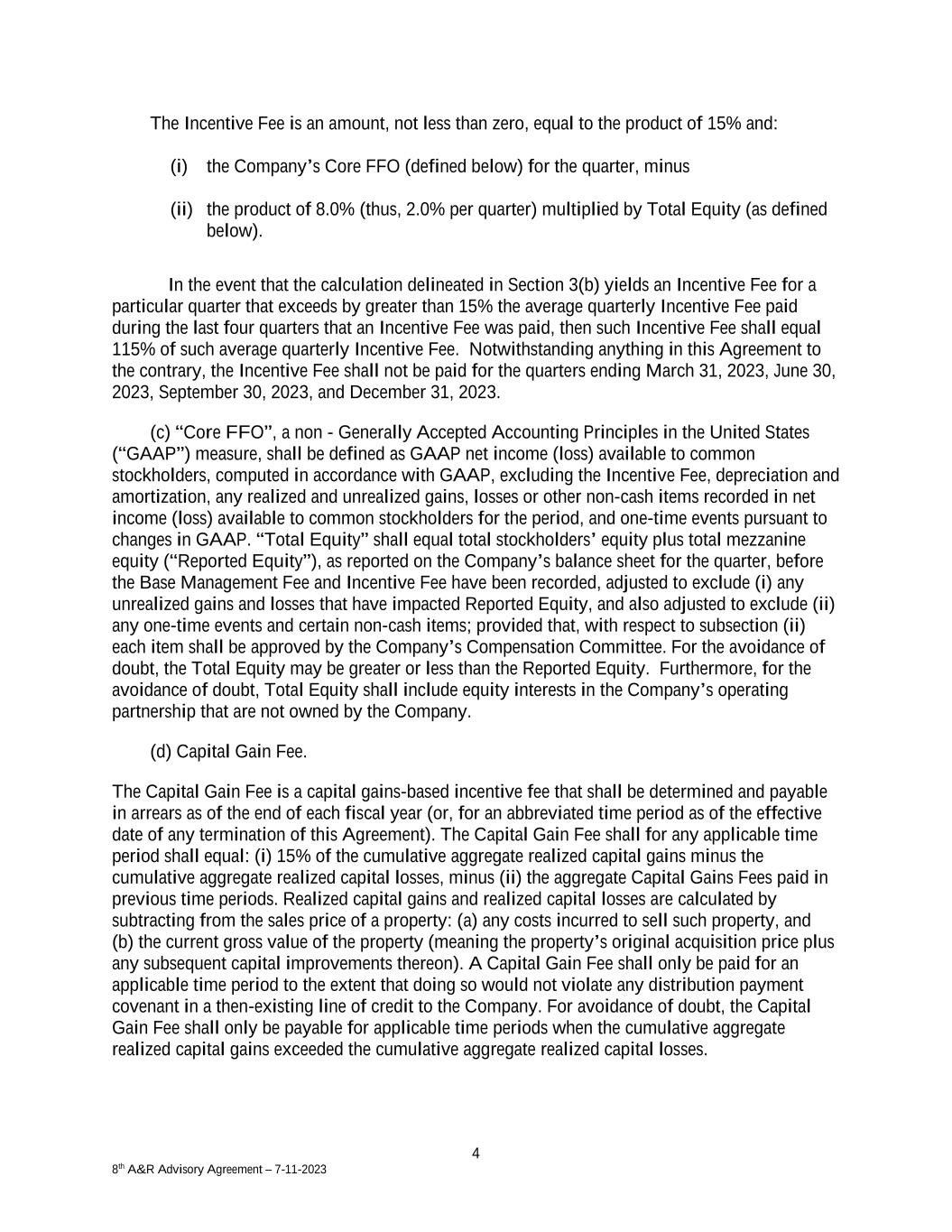 4 8th A&R Advisory Agreement – 7-11-2023 The Incentive Fee is an amount, not less than zero, equal to the product of 15% and: (i) the Company’s Core FFO (defined below) for the quarter, minus (ii) the product of 8.0% (thus, 2.0% per quarter) multiplied by Total Equity (as defined below). In the event that the calculation delineated in Section 3(b) yields an Incentive Fee for a particular quarter that exceeds by greater than 15% the average quarterly Incentive Fee paid during the last four quarters that an Incentive Fee was paid, then such Incentive Fee shall equal 115% of such average quarterly Incentive Fee. Notwithstanding anything in this Agreement to the contrary, the Incentive Fee shall not be paid for the quarters ending March 31, 2023, June 30, 2023, September 30, 2023, and December 31, 2023. (c) “Core FFO”, a non - Generally Accepted Accounting Principles in the United States (“GAAP”) measure, shall be defined as GAAP net income (loss) available to common stockholders, computed in accordance with GAAP, excluding the Incentive Fee, depreciation and amortization, any realized and unrealized gains, losses or other non-cash items recorded in net income (loss) available to common stockholders for the period, and one-time events pursuant to changes in GAAP. “Total Equity” shall equal total stockholders’ equity plus total mezzanine equity (“Reported Equity”), as reported on the Company’s balance sheet for the quarter, before the Base Management Fee and Incentive Fee have been recorded, adjusted to exclude (i) any unrealized gains and losses that have impacted Reported Equity, and also adjusted to exclude (ii) any one-time events and certain non-cash items; provided that, with respect to subsection (ii) each item shall be approved by the Company’s Compensation Committee. For the avoidance of doubt, the Total Equity may be greater or less than the Reported Equity. Furthermore, for the avoidance of doubt, Total Equity shall include equity interests in the Company’s operating partnership that are not owned by the Company. (d) Capital Gain Fee. The Capital Gain Fee is a capital gains-based incentive fee that shall be determined and payable in arrears as of the end of each fiscal year (or, for an abbreviated time period as of the effective date of any termination of this Agreement). The Capital Gain Fee shall for any applicable time period shall equal: (i) 15% of the cumulative aggregate realized capital gains minus the cumulative aggregate realized capital losses, minus (ii) the aggregate Capital Gains Fees paid in previous time periods. Realized capital gains and realized capital losses are calculated by subtracting from the sales price of a property: (a) any costs incurred to sell such property, and (b) the current gross value of the property (meaning the property’s original acquisition price plus any subsequent capital improvements thereon). A Capital Gain Fee shall only be paid for an applicable time period to the extent that doing so would not violate any distribution payment covenant in a then-existing line of credit to the Company. For avoidance of doubt, the Capital Gain Fee shall only be payable for applicable time periods when the cumulative aggregate realized capital gains exceeded the cumulative aggregate realized capital losses.