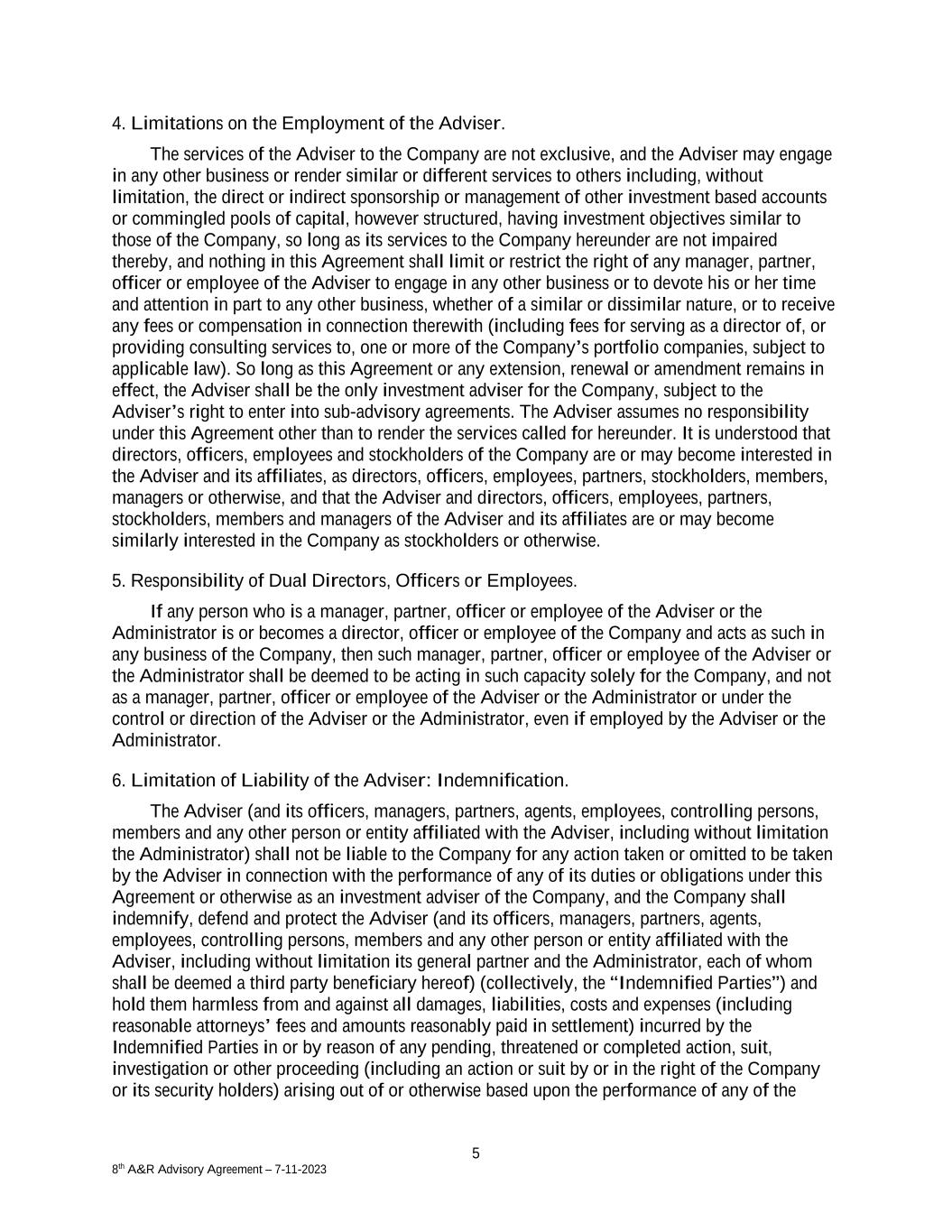 5 8th A&R Advisory Agreement – 7-11-2023 4. Limitations on the Employment of the Adviser. The services of the Adviser to the Company are not exclusive, and the Adviser may engage in any other business or render similar or different services to others including, without limitation, the direct or indirect sponsorship or management of other investment based accounts or commingled pools of capital, however structured, having investment objectives similar to those of the Company, so long as its services to the Company hereunder are not impaired thereby, and nothing in this Agreement shall limit or restrict the right of any manager, partner, officer or employee of the Adviser to engage in any other business or to devote his or her time and attention in part to any other business, whether of a similar or dissimilar nature, or to receive any fees or compensation in connection therewith (including fees for serving as a director of, or providing consulting services to, one or more of the Company’s portfolio companies, subject to applicable law). So long as this Agreement or any extension, renewal or amendment remains in effect, the Adviser shall be the only investment adviser for the Company, subject to the Adviser’s right to enter into sub-advisory agreements. The Adviser assumes no responsibility under this Agreement other than to render the services called for hereunder. It is understood that directors, officers, employees and stockholders of the Company are or may become interested in the Adviser and its affiliates, as directors, officers, employees, partners, stockholders, members, managers or otherwise, and that the Adviser and directors, officers, employees, partners, stockholders, members and managers of the Adviser and its affiliates are or may become similarly interested in the Company as stockholders or otherwise. 5. Responsibility of Dual Directors, Officers or Employees. If any person who is a manager, partner, officer or employee of the Adviser or the Administrator is or becomes a director, officer or employee of the Company and acts as such in any business of the Company, then such manager, partner, officer or employee of the Adviser or the Administrator shall be deemed to be acting in such capacity solely for the Company, and not as a manager, partner, officer or employee of the Adviser or the Administrator or under the control or direction of the Adviser or the Administrator, even if employed by the Adviser or the Administrator. 6. Limitation of Liability of the Adviser: Indemnification. The Adviser (and its officers, managers, partners, agents, employees, controlling persons, members and any other person or entity affiliated with the Adviser, including without limitation the Administrator) shall not be liable to the Company for any action taken or omitted to be taken by the Adviser in connection with the performance of any of its duties or obligations under this Agreement or otherwise as an investment adviser of the Company, and the Company shall indemnify, defend and protect the Adviser (and its officers, managers, partners, agents, employees, controlling persons, members and any other person or entity affiliated with the Adviser, including without limitation its general partner and the Administrator, each of whom shall be deemed a third party beneficiary hereof) (collectively, the “Indemnified Parties”) and hold them harmless from and against all damages, liabilities, costs and expenses (including reasonable attorneys’ fees and amounts reasonably paid in settlement) incurred by the Indemnified Parties in or by reason of any pending, threatened or completed action, suit, investigation or other proceeding (including an action or suit by or in the right of the Company or its security holders) arising out of or otherwise based upon the performance of any of the