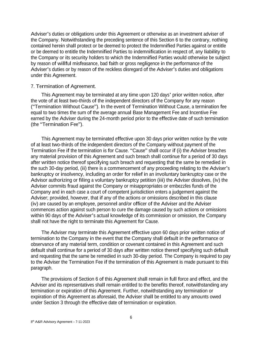 6 8th A&R Advisory Agreement – 7-11-2023 Adviser’s duties or obligations under this Agreement or otherwise as an investment adviser of the Company. Notwithstanding the preceding sentence of this Section 6 to the contrary, nothing contained herein shall protect or be deemed to protect the Indemnified Parties against or entitle or be deemed to entitle the Indemnified Parties to indemnification in respect of, any liability to the Company or its security holders to which the Indemnified Parties would otherwise be subject by reason of willful misfeasance, bad faith or gross negligence in the performance of the Adviser’s duties or by reason of the reckless disregard of the Adviser’s duties and obligations under this Agreement. 7. Termination of Agreement. This Agreement may be terminated at any time upon 120 days’ prior written notice, after the vote of at least two-thirds of the independent directors of the Company for any reason (“Termination Without Cause”). In the event of Termination Without Cause, a termination fee equal to two times the sum of the average annual Base Management Fee and Incentive Fee earned by the Adviser during the 24-month period prior to the effective date of such termination (the “Termination Fee”). This Agreement may be terminated effective upon 30 days prior written notice by the vote of at least two-thirds of the independent directors of the Company without payment of the Termination Fee if the termination is for Cause. “Cause” shall occur if (i) the Adviser breaches any material provision of this Agreement and such breach shall continue for a period of 30 days after written notice thereof specifying such breach and requesting that the same be remedied in the such 30-day period, (ii) there is a commencement of any proceeding relating to the Adviser’s bankruptcy or insolvency, including an order for relief in an involuntary bankruptcy case or the Advisor authorizing or filing a voluntary bankruptcy petition (iii) the Adviser dissolves, (iv) the Adviser commits fraud against the Company or misappropriates or embezzles funds of the Company and in each case a court of competent jurisdiction enters a judgement against the Adviser; provided, however, that if any of the actions or omissions described in this clause (iv) are caused by an employee, personnel and/or officer of the Adviser and the Adviser commences action against such person to cure the damage caused by such actions or omissions within 90 days of the Adviser’s actual knowledge of its commission or omission, the Company shall not have the right to terminate this Agreement for Cause. The Adviser may terminate this Agreement effective upon 60 days prior written notice of termination to the Company in the event that the Company shall default in the performance or observance of any material term, condition or covenant contained in this Agreement and such default shall continue for a period of 30 days after written notice thereof specifying such default and requesting that the same be remedied in such 30-day period. The Company is required to pay to the Adviser the Termination Fee if the termination of this Agreement is made pursuant to this paragraph. The provisions of Section 6 of this Agreement shall remain in full force and effect, and the Adviser and its representatives shall remain entitled to the benefits thereof, notwithstanding any termination or expiration of this Agreement. Further, notwithstanding any termination or expiration of this Agreement as aforesaid, the Adviser shall be entitled to any amounts owed under Section 3 through the effective date of termination or expiration.