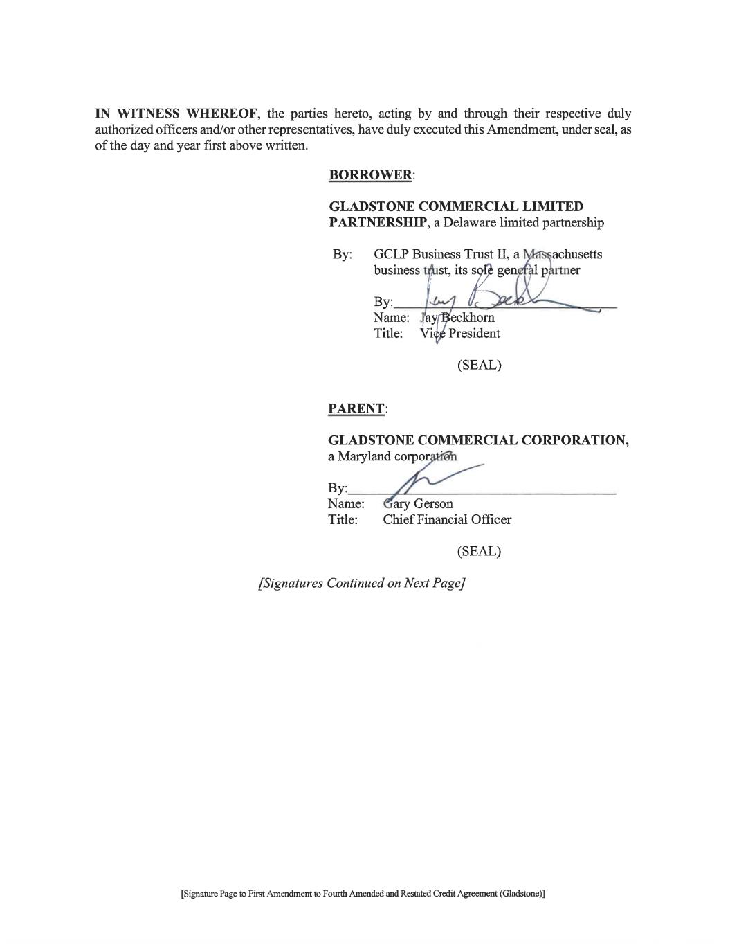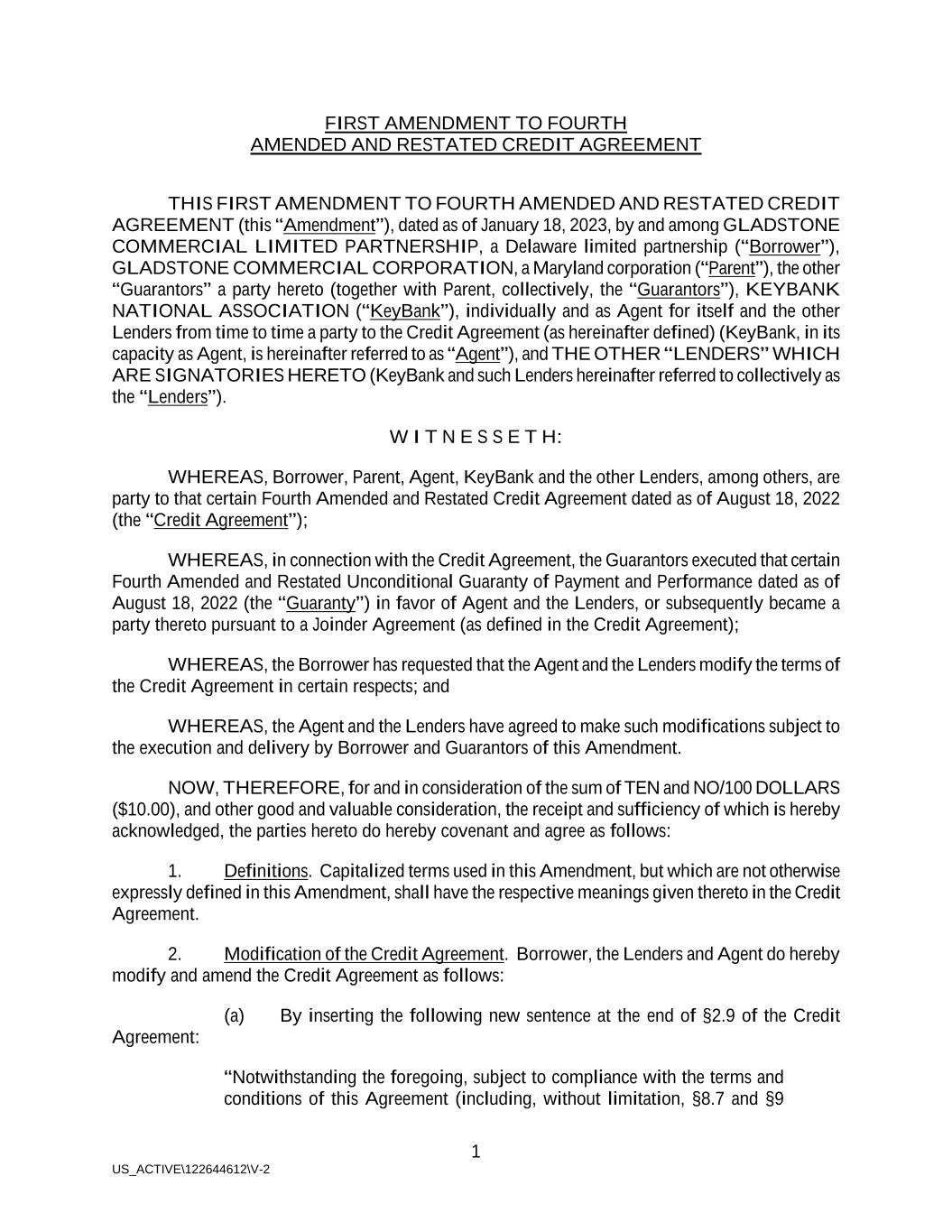 1 US_ACTIVE\122644612\V-2 FIRST AMENDMENT TO FOURTH AMENDED AND RESTATED CREDIT AGREEMENT THIS FIRST AMENDMENT TO FOURTH AMENDED AND RESTATED CREDIT AGREEMENT (this “Amendment”), dated as of January 18, 2023, by and among GLADSTONE COMMERCIAL LIMITED PARTNERSHIP, a Delaware limited partnership (“Borrower”), GLADSTONE COMMERCIAL CORPORATION, a Maryland corporation (“Parent”), the other “Guarantors” a party hereto (together with Parent, collectively, the “Guarantors”), KEYBANK NATIONAL ASSOCIATION (“KeyBank”), individually and as Agent for itself and the other Lenders from time to time a party to the Credit Agreement (as hereinafter defined) (KeyBank, in its capacity as Agent, is hereinafter referred to as “Agent”), and THE OTHER “LENDERS” WHICH ARE SIGNATORIES HERETO (KeyBank and such Lenders hereinafter referred to collectively as the “Lenders”). W I T N E S S E T H: WHEREAS, Borrower, Parent, Agent, KeyBank and the other Lenders, among others, are party to that certain Fourth Amended and Restated Credit Agreement dated as of August 18, 2022 (the “Credit Agreement”); WHEREAS, in connection with the Credit Agreement, the Guarantors executed that certain Fourth Amended and Restated Unconditional Guaranty of Payment and Performance dated as of August 18, 2022 (the “Guaranty”) in favor of Agent and the Lenders, or subsequently became a party thereto pursuant to a Joinder Agreement (as defined in the Credit Agreement); WHEREAS, the Borrower has requested that the Agent and the Lenders modify the terms of the Credit Agreement in certain respects; and WHEREAS, the Agent and the Lenders have agreed to make such modifications subject to the execution and delivery by Borrower and Guarantors of this Amendment. NOW, THEREFORE, for and in consideration of the sum of TEN and NO/100 DOLLARS ($10.00), and other good and valuable consideration, the receipt and sufficiency of which is hereby acknowledged, the parties hereto do hereby covenant and agree as follows: 1. Definitions. Capitalized terms used in this Amendment, but which are not otherwise expressly defined in this Amendment, shall have the respective meanings given thereto in the Credit Agreement. 2. Modification of the Credit Agreement. Borrower, the Lenders and Agent do hereby modify and amend the Credit Agreement as follows: (a) By inserting the following new sentence at the end of §2.9 of the Credit Agreement: “Notwithstanding the foregoing, subject to compliance with the terms and conditions of this Agreement (including, without limitation, §8.7 and §9