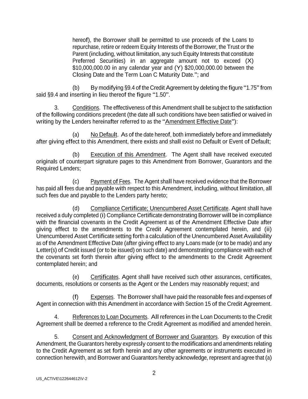 2 US_ACTIVE\122644612\V-2 hereof), the Borrower shall be permitted to use proceeds of the Loans to repurchase, retire or redeem Equity Interests of the Borrower, the Trust or the Parent (including, without limitation, any such Equity Interests that constitute Preferred Securities) in an aggregate amount not to exceed (X) $10,000,000.00 in any calendar year and (Y) $20,000,000.00 between the Closing Date and the Term Loan C Maturity Date.”; and (b) By modifying §9.4 of the Credit Agreement by deleting the figure “1.75” from said §9.4 and inserting in lieu thereof the figure “1.50”. 3. Conditions. The effectiveness of this Amendment shall be subject to the satisfaction of the following conditions precedent (the date all such conditions have been satisfied or waived in writing by the Lenders hereinafter referred to as the “Amendment Effective Date”): (a) No Default. As of the date hereof, both immediately before and immediately after giving effect to this Amendment, there exists and shall exist no Default or Event of Default; (b) Execution of this Amendment. The Agent shall have received executed originals of counterpart signature pages to this Amendment from Borrower, Guarantors and the Required Lenders; (c) Payment of Fees. The Agent shall have received evidence that the Borrower has paid all fees due and payable with respect to this Amendment, including, without limitation, all such fees due and payable to the Lenders party hereto; (d) Compliance Certificate; Unencumbered Asset Certificate. Agent shall have received a duly completed (i) Compliance Certificate demonstrating Borrower will be in compliance with the financial covenants in the Credit Agreement as of the Amendment Effective Date after giving effect to the amendments to the Credit Agreement contemplated herein, and (ii) Unencumbered Asset Certificate setting forth a calculation of the Unencumbered Asset Availability as of the Amendment Effective Date (after giving effect to any Loans made (or to be made) and any Letter(s) of Credit issued (or to be issued) on such date) and demonstrating compliance with each of the covenants set forth therein after giving effect to the amendments to the Credit Agreement contemplated herein; and (e) Certificates. Agent shall have received such other assurances, certificates, documents, resolutions or consents as the Agent or the Lenders may reasonably request; and (f) Expenses. The Borrower shall have paid the reasonable fees and expenses of Agent in connection with this Amendment in accordance with Section 15 of the Credit Agreement. 4. References to Loan Documents. All references in the Loan Documents to the Credit Agreement shall be deemed a reference to the Credit Agreement as modified and amended herein. 5. Consent and Acknowledgment of Borrower and Guarantors. By execution of this Amendment, the Guarantors hereby expressly consent to the modifications and amendments relating to the Credit Agreement as set forth herein and any other agreements or instruments executed in connection herewith, and Borrower and Guarantors hereby acknowledge, represent and agree that (a)