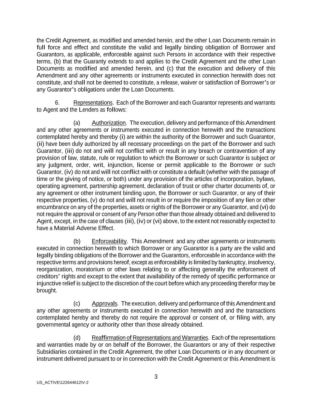 3 US_ACTIVE\122644612\V-2 the Credit Agreement, as modified and amended herein, and the other Loan Documents remain in full force and effect and constitute the valid and legally binding obligation of Borrower and Guarantors, as applicable, enforceable against such Persons in accordance with their respective terms, (b) that the Guaranty extends to and applies to the Credit Agreement and the other Loan Documents as modified and amended herein, and (c) that the execution and delivery of this Amendment and any other agreements or instruments executed in connection herewith does not constitute, and shall not be deemed to constitute, a release, waiver or satisfaction of Borrower’s or any Guarantor’s obligations under the Loan Documents. 6. Representations. Each of the Borrower and each Guarantor represents and warrants to Agent and the Lenders as follows: (a) Authorization. The execution, delivery and performance of this Amendment and any other agreements or instruments executed in connection herewith and the transactions contemplated hereby and thereby (i) are within the authority of the Borrower and such Guarantor, (ii) have been duly authorized by all necessary proceedings on the part of the Borrower and such Guarantor, (iii) do not and will not conflict with or result in any breach or contravention of any provision of law, statute, rule or regulation to which the Borrower or such Guarantor is subject or any judgment, order, writ, injunction, license or permit applicable to the Borrower or such Guarantor, (iv) do not and will not conflict with or constitute a default (whether with the passage of time or the giving of notice, or both) under any provision of the articles of incorporation, bylaws, operating agreement, partnership agreement, declaration of trust or other charter documents of, or any agreement or other instrument binding upon, the Borrower or such Guarantor, or any of their respective properties, (v) do not and will not result in or require the imposition of any lien or other encumbrance on any of the properties, assets or rights of the Borrower or any Guarantor, and (vi) do not require the approval or consent of any Person other than those already obtained and delivered to Agent, except, in the case of clauses (iii), (iv) or (vi) above, to the extent not reasonably expected to have a Material Adverse Effect. (b) Enforceability. This Amendment and any other agreements or instruments executed in connection herewith to which Borrower or any Guarantor is a party are the valid and legally binding obligations of the Borrower and the Guarantors, enforceable in accordance with the respective terms and provisions hereof, except as enforceability is limited by bankruptcy, insolvency, reorganization, moratorium or other laws relating to or affecting generally the enforcement of creditors’ rights and except to the extent that availability of the remedy of specific performance or injunctive relief is subject to the discretion of the court before which any proceeding therefor may be brought. (c) Approvals. The execution, delivery and performance of this Amendment and any other agreements or instruments executed in connection herewith and and the transactions contemplated hereby and thereby do not require the approval or consent of, or filing with, any governmental agency or authority other than those already obtained. (d) Reaffirmation of Representations and Warranties. Each of the representations and warranties made by or on behalf of the Borrower, the Guarantors or any of their respective Subsidiaries contained in the Credit Agreement, the other Loan Documents or in any document or instrument delivered pursuant to or in connection with the Credit Agreement or this Amendment is