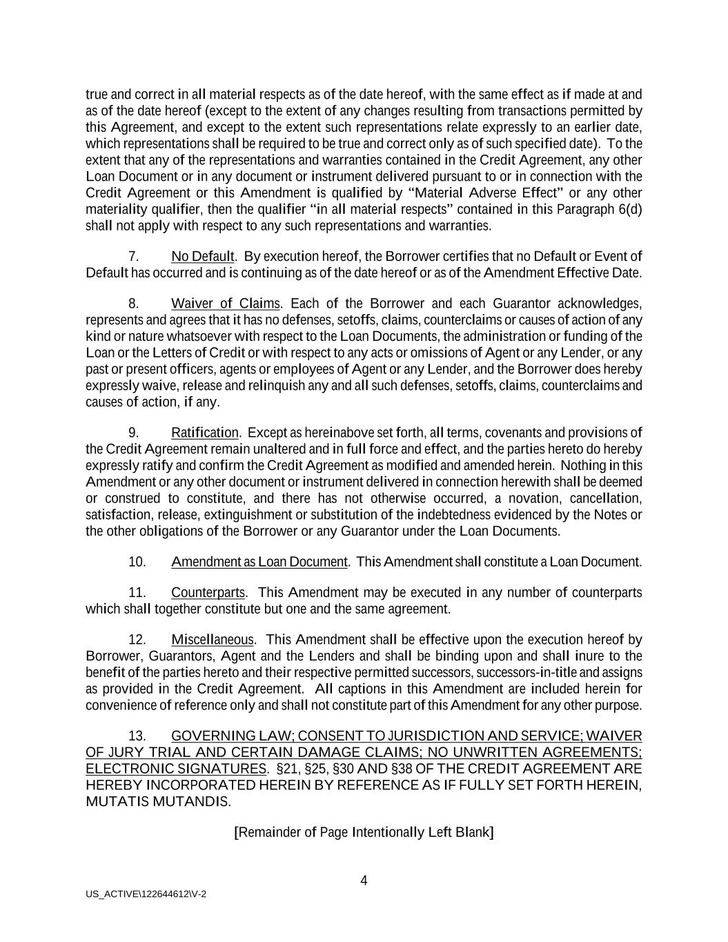 4 US_ACTIVE\122644612\V-2 true and correct in all material respects as of the date hereof, with the same effect as if made at and as of the date hereof (except to the extent of any changes resulting from transactions permitted by this Agreement, and except to the extent such representations relate expressly to an earlier date, which representations shall be required to be true and correct only as of such specified date). To the extent that any of the representations and warranties contained in the Credit Agreement, any other Loan Document or in any document or instrument delivered pursuant to or in connection with the Credit Agreement or this Amendment is qualified by “Material Adverse Effect” or any other materiality qualifier, then the qualifier “in all material respects” contained in this Paragraph 6(d) shall not apply with respect to any such representations and warranties. 7. No Default. By execution hereof, the Borrower certifies that no Default or Event of Default has occurred and is continuing as of the date hereof or as of the Amendment Effective Date. 8. Waiver of Claims. Each of the Borrower and each Guarantor acknowledges, represents and agrees that it has no defenses, setoffs, claims, counterclaims or causes of action of any kind or nature whatsoever with respect to the Loan Documents, the administration or funding of the Loan or the Letters of Credit or with respect to any acts or omissions of Agent or any Lender, or any past or present officers, agents or employees of Agent or any Lender, and the Borrower does hereby expressly waive, release and relinquish any and all such defenses, setoffs, claims, counterclaims and causes of action, if any. 9. Ratification. Except as hereinabove set forth, all terms, covenants and provisions of the Credit Agreement remain unaltered and in full force and effect, and the parties hereto do hereby expressly ratify and confirm the Credit Agreement as modified and amended herein. Nothing in this Amendment or any other document or instrument delivered in connection herewith shall be deemed or construed to constitute, and there has not otherwise occurred, a novation, cancellation, satisfaction, release, extinguishment or substitution of the indebtedness evidenced by the Notes or the other obligations of the Borrower or any Guarantor under the Loan Documents. 10. Amendment as Loan Document. This Amendment shall constitute a Loan Document. 11. Counterparts. This Amendment may be executed in any number of counterparts which shall together constitute but one and the same agreement. 12. Miscellaneous. This Amendment shall be effective upon the execution hereof by Borrower, Guarantors, Agent and the Lenders and shall be binding upon and shall inure to the benefit of the parties hereto and their respective permitted successors, successors-in-title and assigns as provided in the Credit Agreement. All captions in this Amendment are included herein for convenience of reference only and shall not constitute part of this Amendment for any other purpose. 13. GOVERNING LAW; CONSENT TO JURISDICTION AND SERVICE; WAIVER OF JURY TRIAL AND CERTAIN DAMAGE CLAIMS; NO UNWRITTEN AGREEMENTS; ELECTRONIC SIGNATURES. §21, §25, §30 AND §38 OF THE CREDIT AGREEMENT ARE HEREBY INCORPORATED HEREIN BY REFERENCE AS IF FULLY SET FORTH HEREIN, MUTATIS MUTANDIS. [Remainder of Page Intentionally Left Blank]