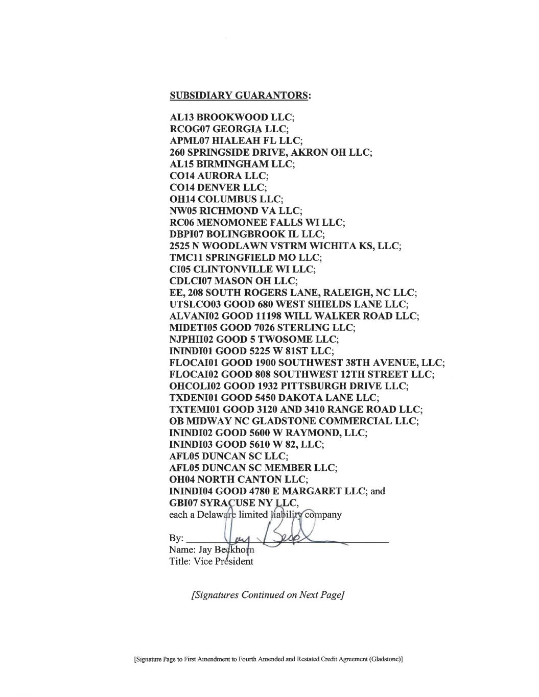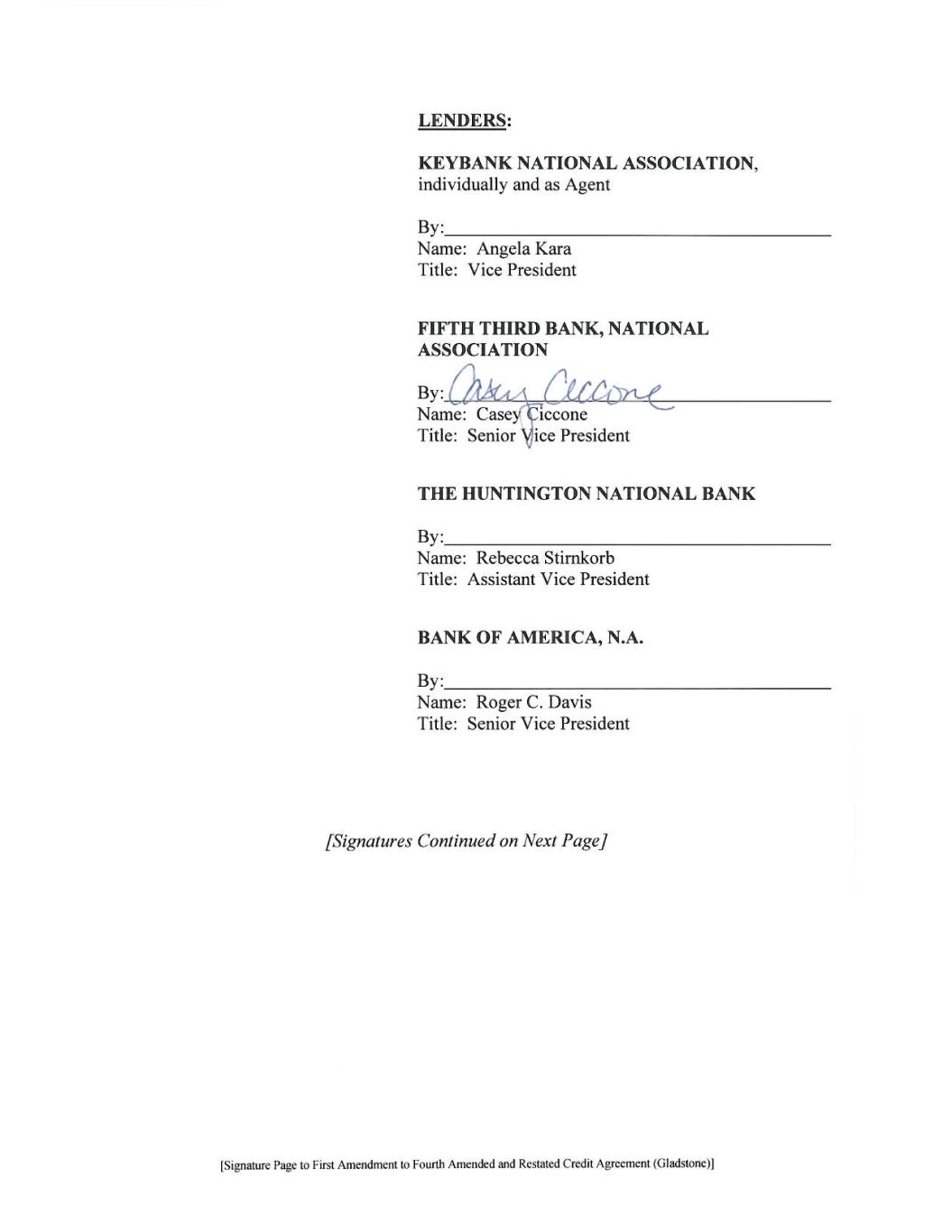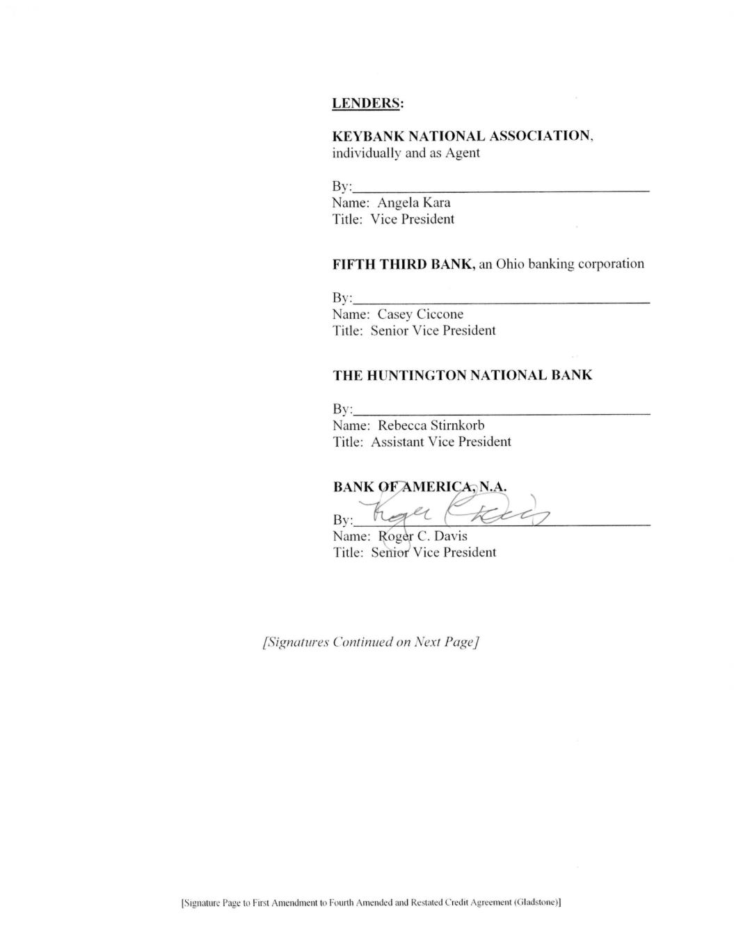 [Signature Page to First Amendment to Fourth Amended and Restated Credit Agreement (Gladstone)] LENDERS: KEYBANK NATIONAL ASSOCIATION, individually and as Agent By: Name: Angela Kara Title: Vice President FIFTH THIRD BANK, an Ohio banking corporation By: Name: Casey Ciccone Title: Senior Vice President THE HUNTINGTON NATIONAL BANK By: Name: Rebecca Stirnkorb Title: Assistant Vice President BANK OF AMERICA, N.A. By: Name: Roger C. Davis Title: Senior Vice President [Signatures Continued on Next Page]