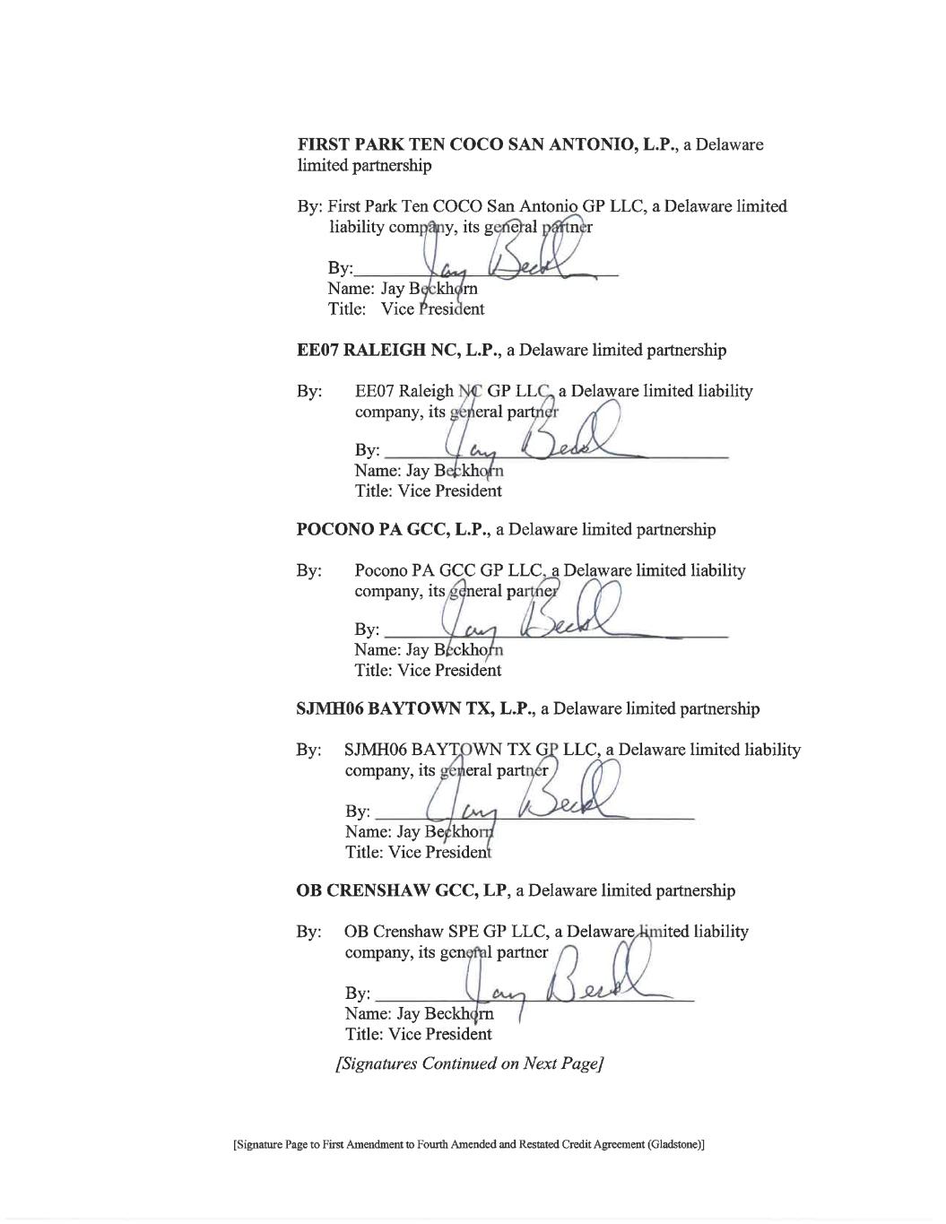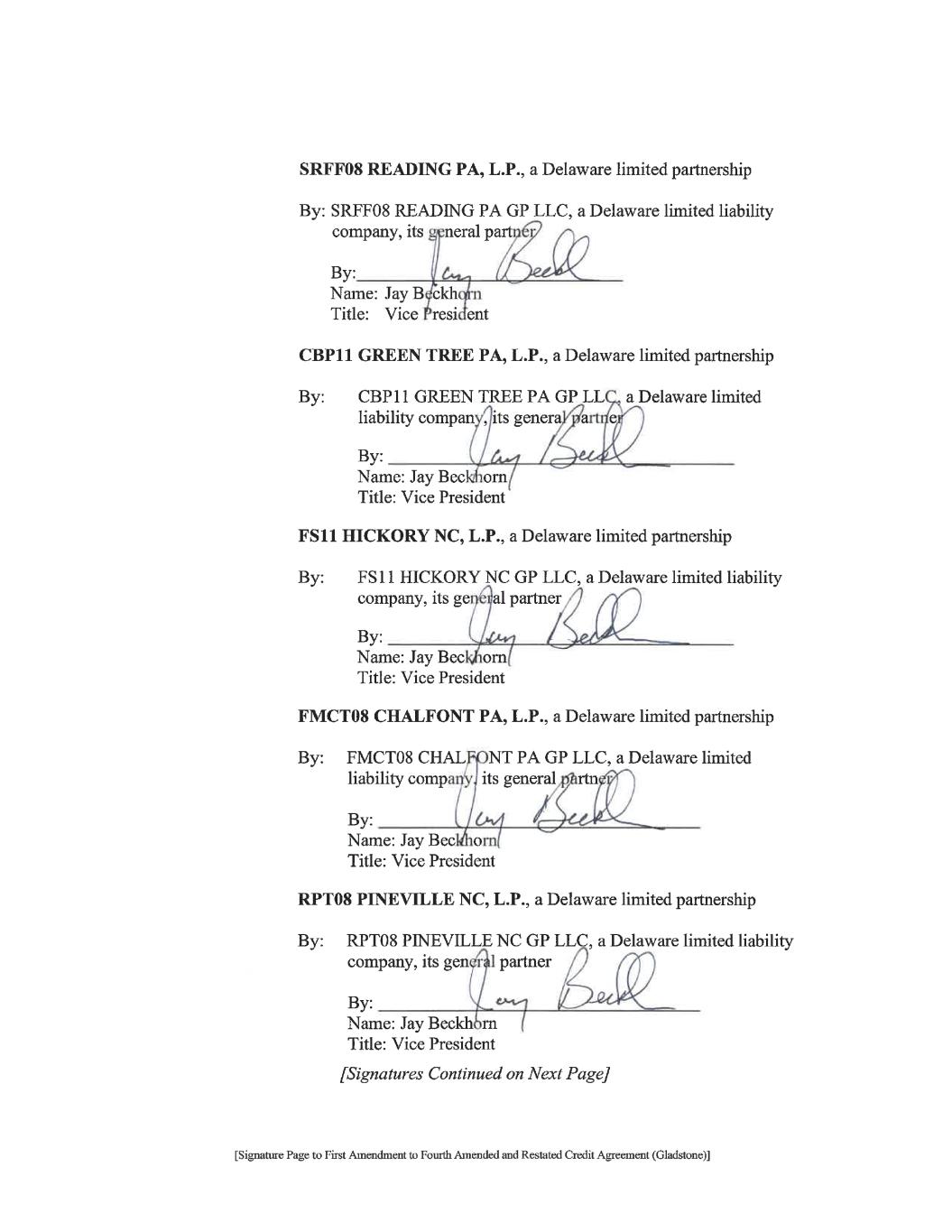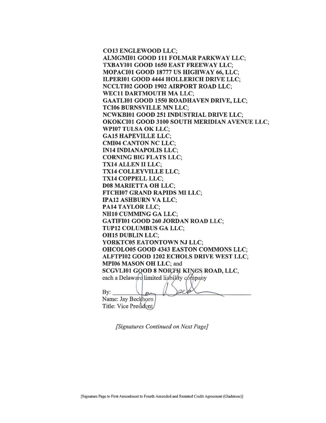[Signature Page to First Amendment to Fourth Amended and Restated Credit Agreement (Gladstone)] LENDERS: KEYBANK NATIONAL ASSOCIATION, individually and as Agent By: Name: Angela Kara Title: Vice President FIFTH THIRD BANK, an Ohio banking corporation By: Name: Casey Ciccone Title: Senior Vice President THE HUNTINGTON NATIONAL BANK By: Name: Rebecca Stirnkorb Title: Assistant Vice President BANK OF AMERICA, N.A. By: Name: Roger C. Davis Title: Senior Vice President [Signatures Continued on Next Page]