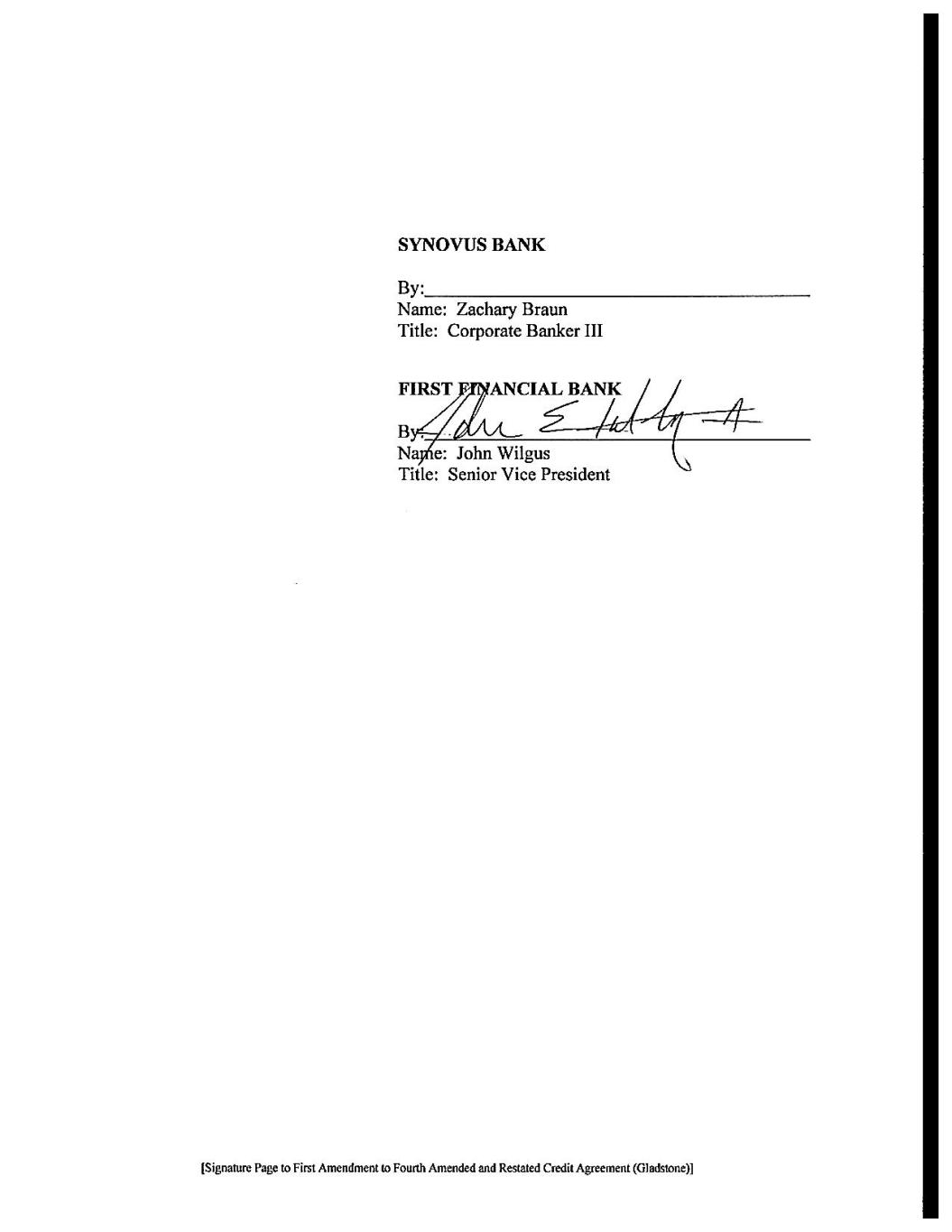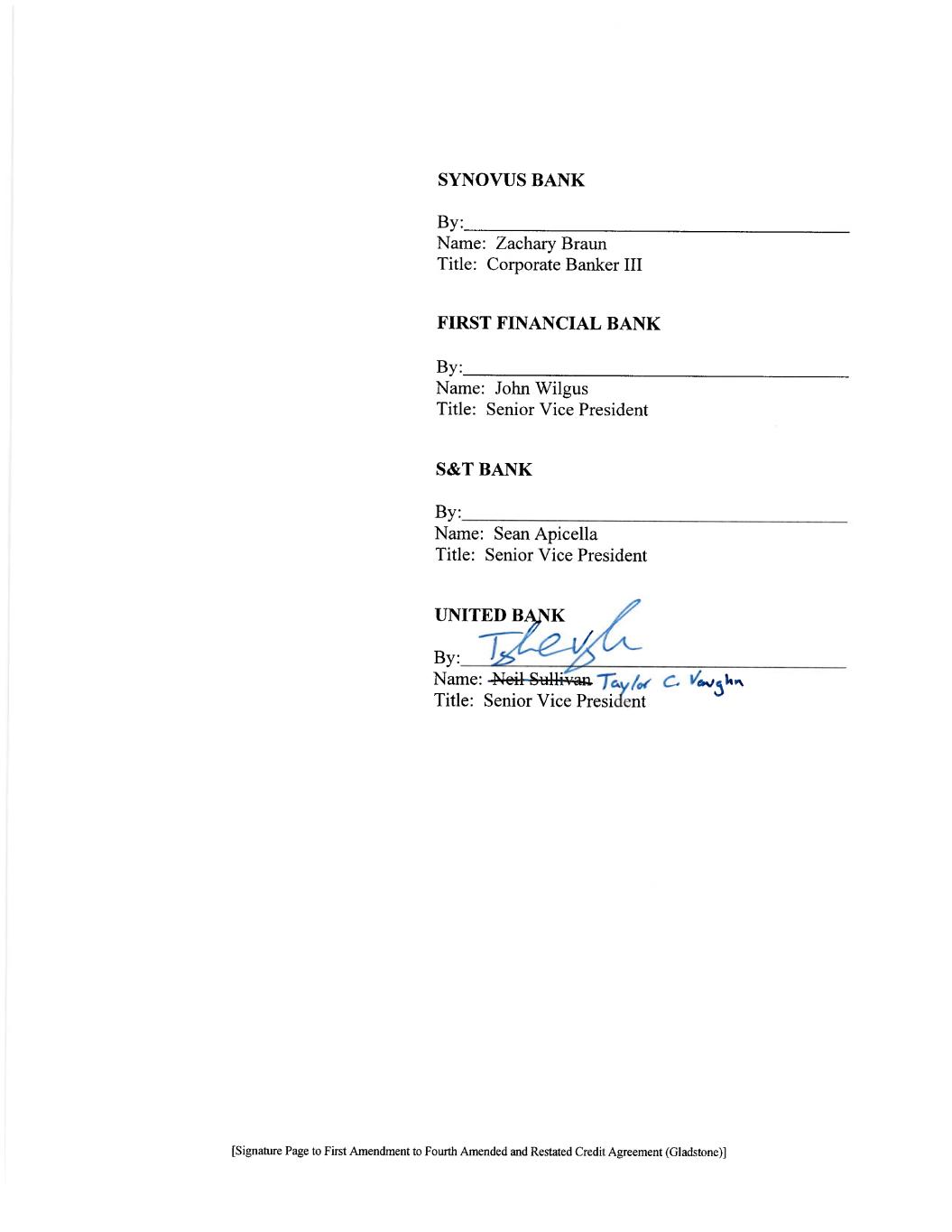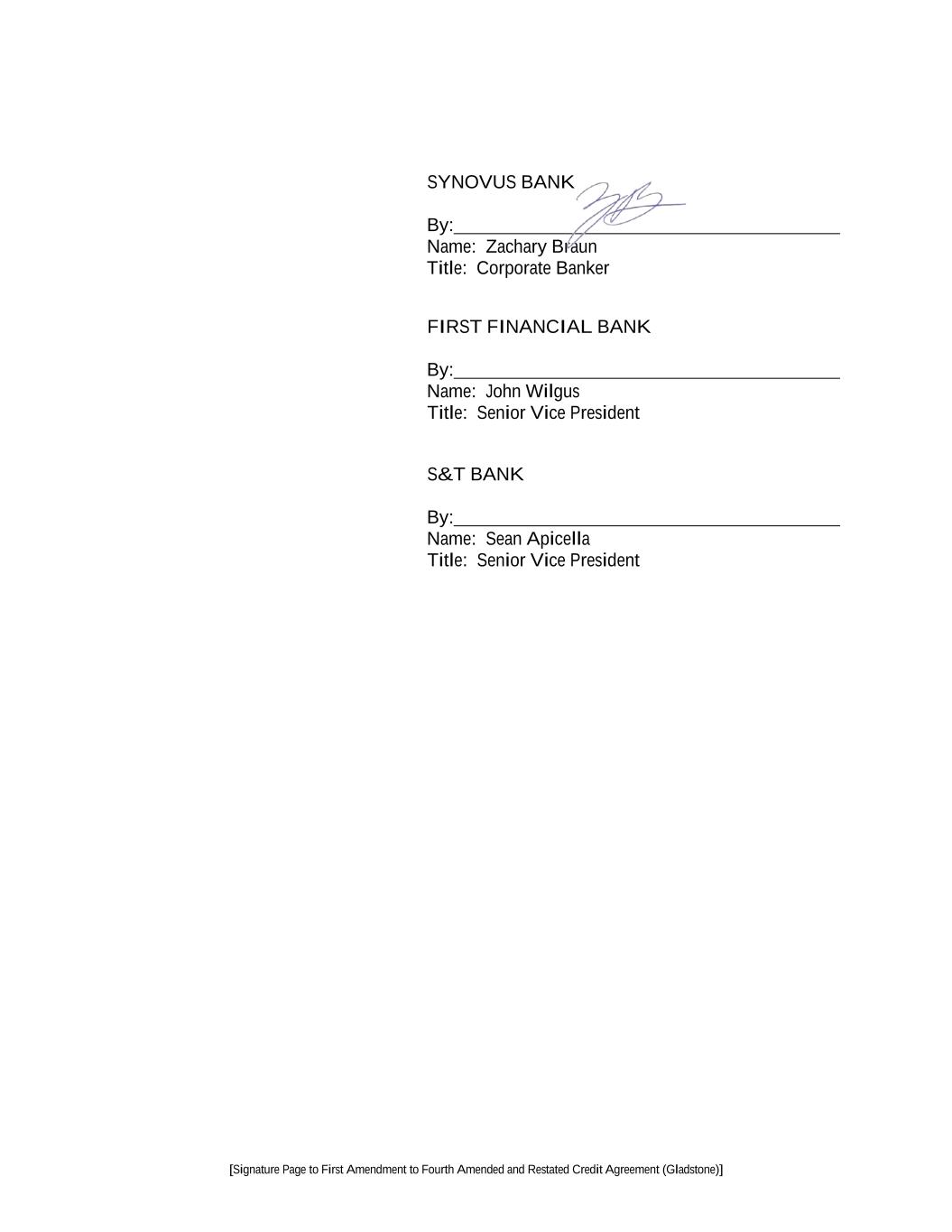 [Signature Page to First Amendment to Fourth Amended and Restated Credit Agreement (Gladstone)] SYNOVUS BANK By: Name: Zachary Braun Title: Corporate Banker FIRST FINANCIAL BANK By: Name: John Wilgus Title: Senior Vice President S&T BANK By: Name: Sean Apicella Title: Senior Vice President