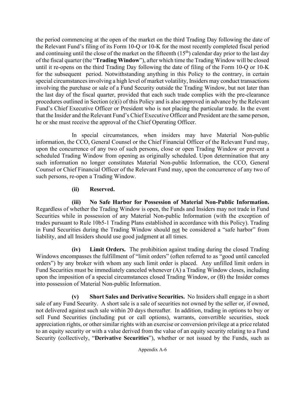 Appendix A-6 the period commencing at the open of the market on the third Trading Day following the date of the Relevant Fund’s filing of its Form 10-Q or 10-K for the most recently completed fiscal period and continuing until the close of the market on the fifteenth (15th) calendar day prior to the last day of the fiscal quarter (the “Trading Window”), after which time the Trading Window will be closed until it re-opens on the third Trading Day following the date of filing of the Form 10-Q or 10-K for the subsequent period. Notwithstanding anything in this Policy to the contrary, in certain special circumstances involving a high level of market volatility, Insiders may conduct transactions involving the purchase or sale of a Fund Security outside the Trading Window, but not later than the last day of the fiscal quarter, provided that each such trade complies with the pre-clearance procedures outlined in Section (e)(i) of this Policy and is also approved in advance by the Relevant Fund’s Chief Executive Officer or President who is not placing the particular trade. In the event that the Insider and the Relevant Fund’s Chief Executive Officer and President are the same person, he or she must receive the approval of the Chief Operating Officer. In special circumstances, when insiders may have Material Non-public information, the CCO, General Counsel or the Chief Financial Officer of the Relevant Fund may, upon the concurrence of any two of such persons, close or open Trading Window or prevent a scheduled Trading Window from opening as originally scheduled. Upon determination that any such information no longer constitutes Material Non-public Information, the CCO, General Counsel or Chief Financial Officer of the Relevant Fund may, upon the concurrence of any two of such persons, re-open a Trading Window. (ii) Reserved. (iii) No Safe Harbor for Possession of Material Non-Public Information. Regardless of whether the Trading Window is open, the Funds and Insiders may not trade in Fund Securities while in possession of any Material Non-public Information (with the exception of trades pursuant to Rule 10b5-1 Trading Plans established in accordance with this Policy). Trading in Fund Securities during the Trading Window should not be considered a “safe harbor” from liability, and all Insiders should use good judgment at all times. (iv) Limit Orders. The prohibition against trading during the closed Trading Windows encompasses the fulfillment of “limit orders” (often referred to as “good until canceled orders”) by any broker with whom any such limit order is placed. Any unfilled limit orders in Fund Securities must be immediately canceled whenever (A) a Trading Window closes, including upon the imposition of a special circumstances closed Trading Window, or (B) the Insider comes into possession of Material Non-public Information. (v) Short Sales and Derivative Securities. No Insiders shall engage in a short sale of any Fund Security. A short sale is a sale of securities not owned by the seller or, if owned, not delivered against such sale within 20 days thereafter. In addition, trading in options to buy or sell Fund Securities (including put or call options), warrants, convertible securities, stock appreciation rights, or other similar rights with an exercise or conversion privilege at a price related to an equity security or with a value derived from the value of an equity security relating to a Fund Security (collectively, “Derivative Securities”), whether or not issued by the Funds, such as
