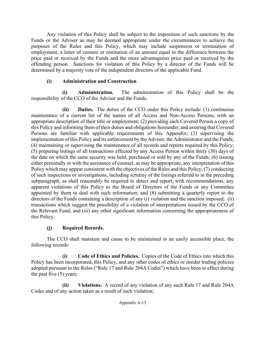 Appendix A-13 Any violation of this Policy shall be subject to the imposition of such sanctions by the Funds or the Adviser as may be deemed appropriate under the circumstances to achieve the purposes of the Rules and this Policy, which may include suspension or termination of employment, a letter of censure or restitution of an amount equal to the difference between the price paid or received by the Funds and the more advantageous price paid or received by the offending person. Sanctions for violation of this Policy by a director of the Funds will be determined by a majority vote of the independent directors of the applicable Fund. (i) Administration and Construction (i) Administration. The administration of this Policy shall be the responsibility of the CCO of the Adviser and the Funds. (ii) Duties. The duties of the CCO under this Policy include: (1) continuous maintenance of a current list of the names of all Access and Non-Access Persons, with an appropriate description of their title or employment; (2) providing each Covered Person a copy of this Policy and informing them of their duties and obligations hereunder, and assuring that Covered Persons are familiar with applicable requirements of this Appendix; (3) supervising the implementation of this Policy and its enforcement by the Adviser, the Administrator and the Funds; (4) maintaining or supervising the maintenance of all records and reports required by this Policy; (5) preparing listings of all transactions effected by any Access Person within thirty (30) days of the date on which the same security was held, purchased or sold by any of the Funds; (6) issuing either personally or with the assistance of counsel, as may be appropriate, any interpretation of this Policy which may appear consistent with the objectives of the Rules and this Policy; (7) conducting of such inspections or investigations, including scrutiny of the listings referred to in the preceding subparagraph, as shall reasonably be required to detect and report, with recommendations, any apparent violations of this Policy to the Board of Directors of the Funds or any Committee appointed by them to deal with such information; and (8) submitting a quarterly report to the directors of the Funds containing a description of any (i) violation and the sanction imposed; (ii) transactions which suggest the possibility of a violation of interpretations issued by the CCO of the Relevant Fund; and (iii) any other significant information concerning the appropriateness of this Policy. (j) Required Records. The CCO shall maintain and cause to be maintained in an easily accessible place, the following records: (i) Code of Ethics and Policies. Copies of the Code of Ethics into which this Policy has been incorporated, this Policy, and any other codes of ethics or insider trading policies adopted pursuant to the Rules (“Rule 17 and Rule 204A Codes”) which have been in effect during the past five (5) years; (ii) Violations. A record of any violation of any such Rule 17 and Rule 204A Codes and of any action taken as a result of such violation;